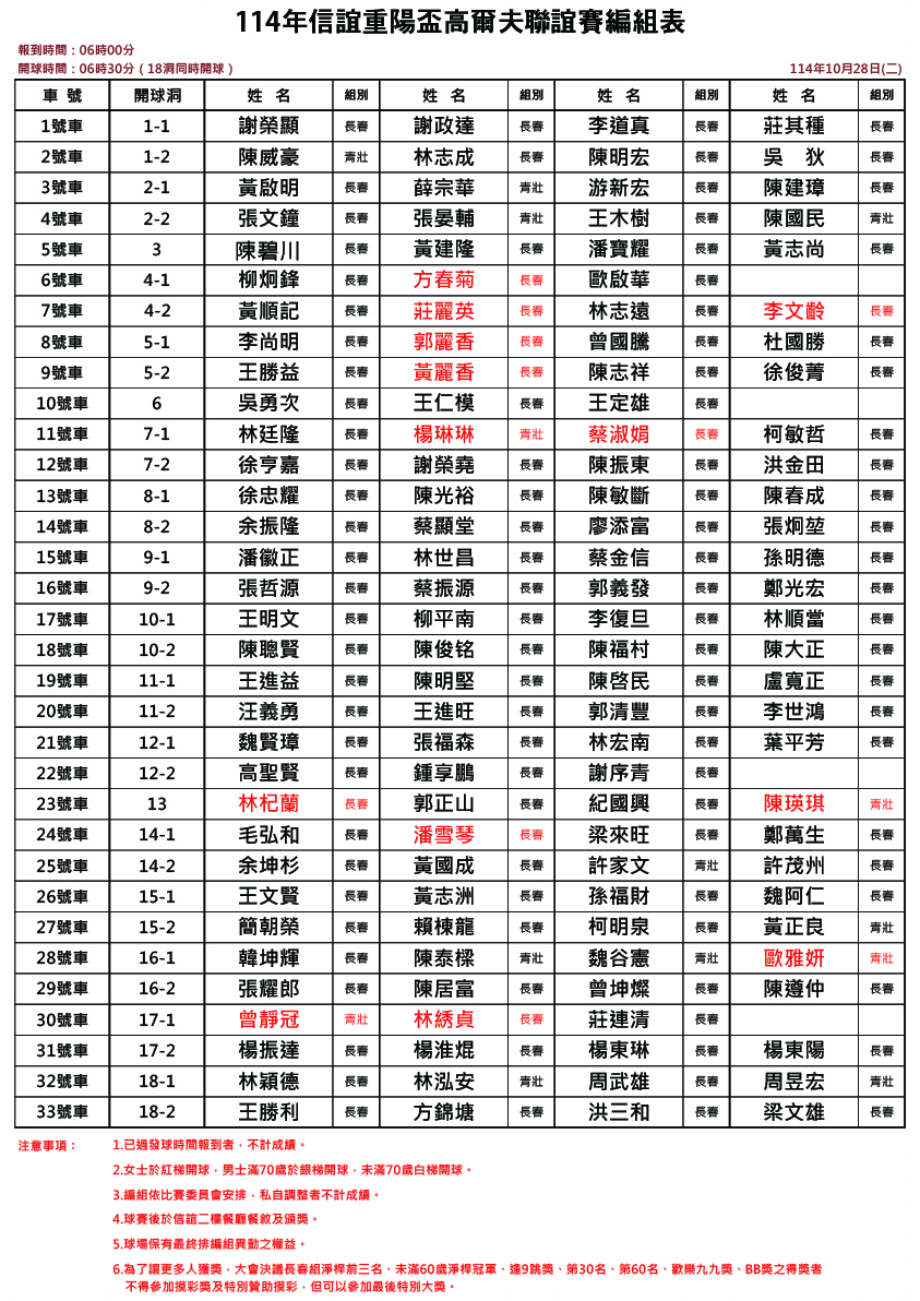 114年信誼重陽盃高爾夫球聯誼賽-編組表