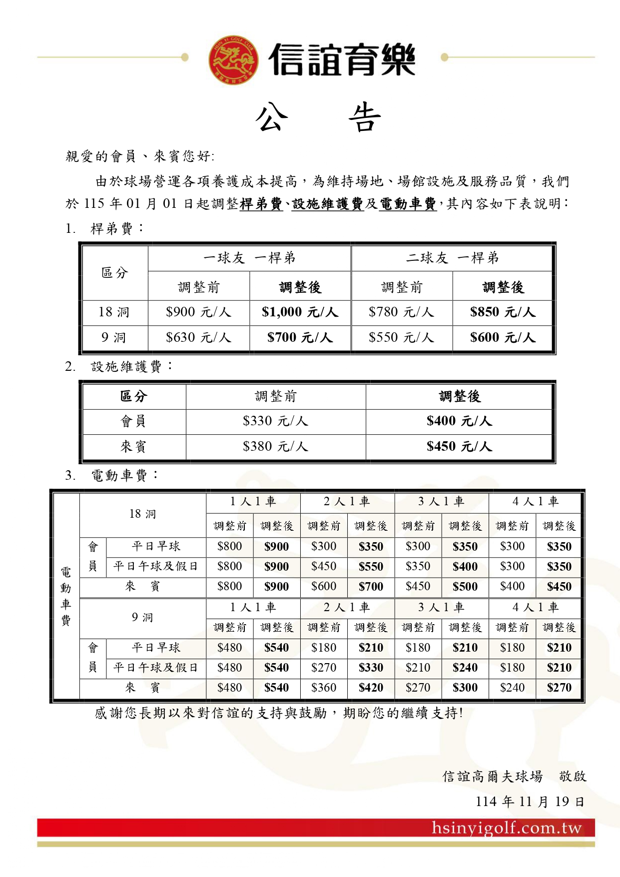 由於球場營運各項養護成本提高,為維持場地、場館設施及服務品質,我們於115年01月01日起調整 #桿弟費、#設施維護費 及 #電動車費,其內容如下表說明: