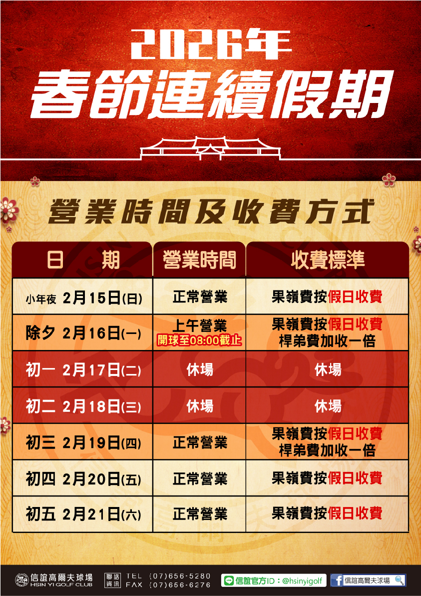 開球至早上8點整為止,果嶺費按假日收費,桿弟費按標準加收一倍。