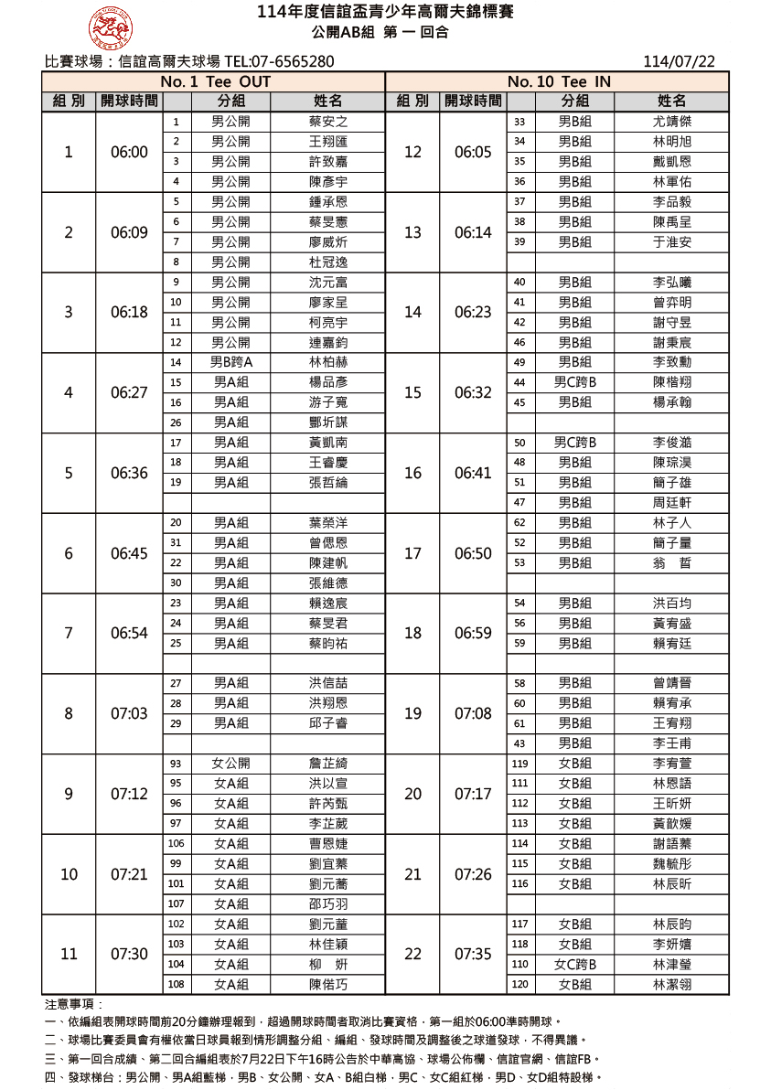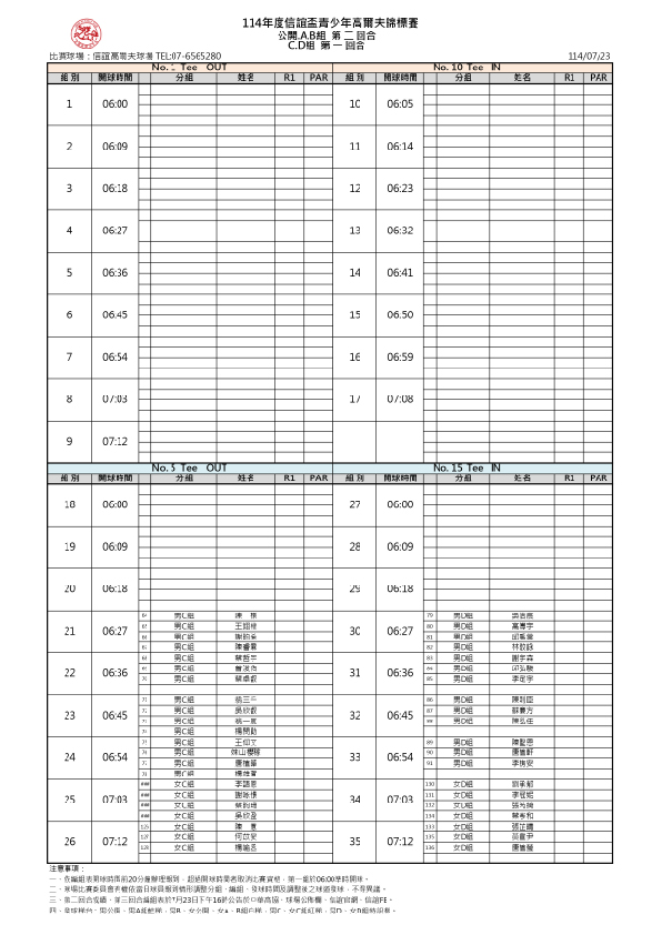 114年信誼盃青少年高爾夫球錦標賽-R1編組表